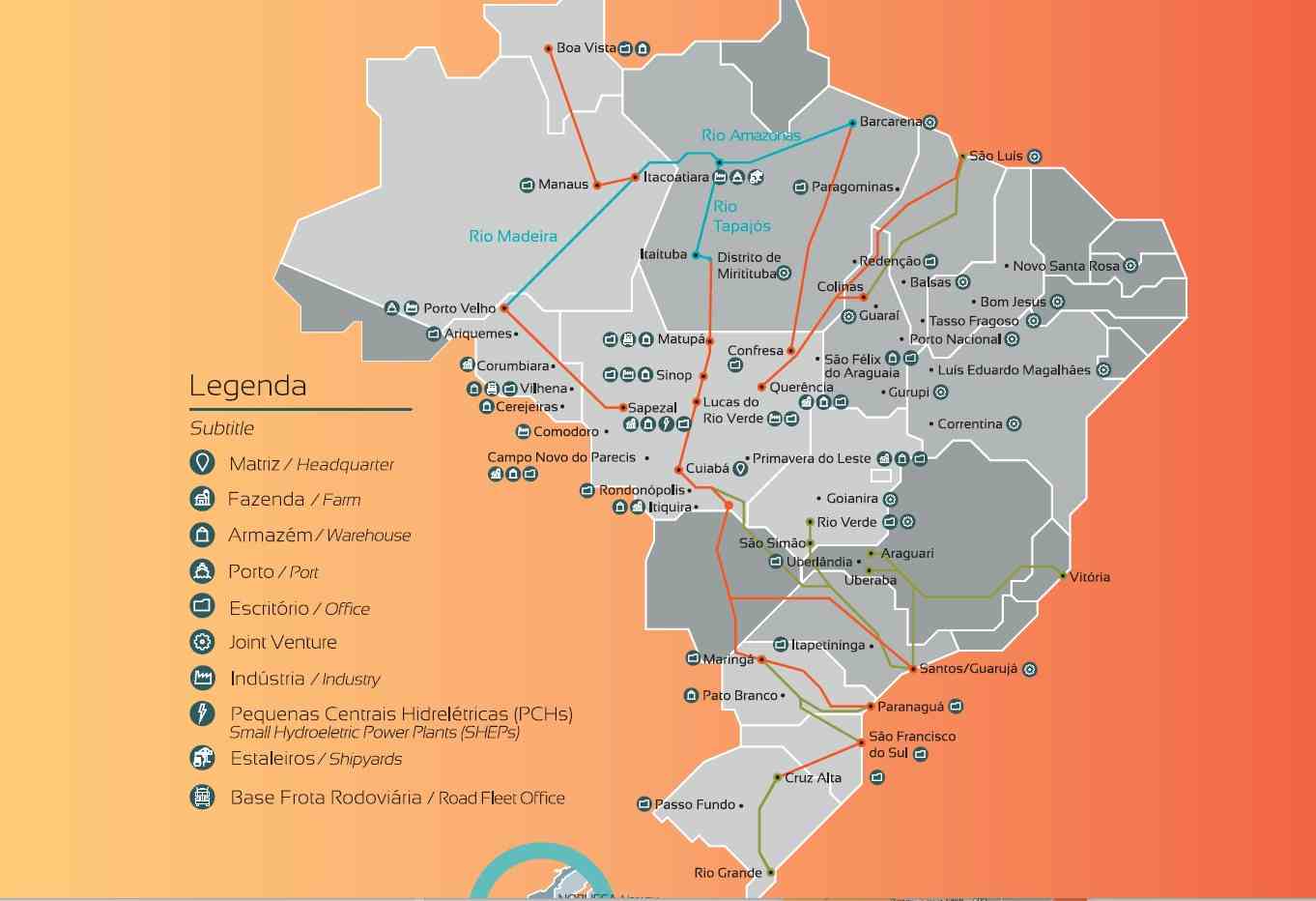 Assim, o mapa do Brasil da Amaggi mostra uma grande concentração de fazendas, escritórios, armazéns, indústrias, bases logísticas, portos e estaleiros em sua parte mais setentrional. E espaços vazios na metade meridional, mais ocupada por linhas que indicam corredores por onde a companhia escoa parte de suas operações.