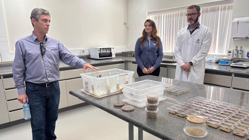 Rodrigo Neves, head de pesquisa e desenvolvimento para proteção de cultivos e biológicos da Corteva na América Latina (à esquerda), com dois pesquisadores mostrando o "cultivo de pragas" feito na unidade de Mogi Mirim